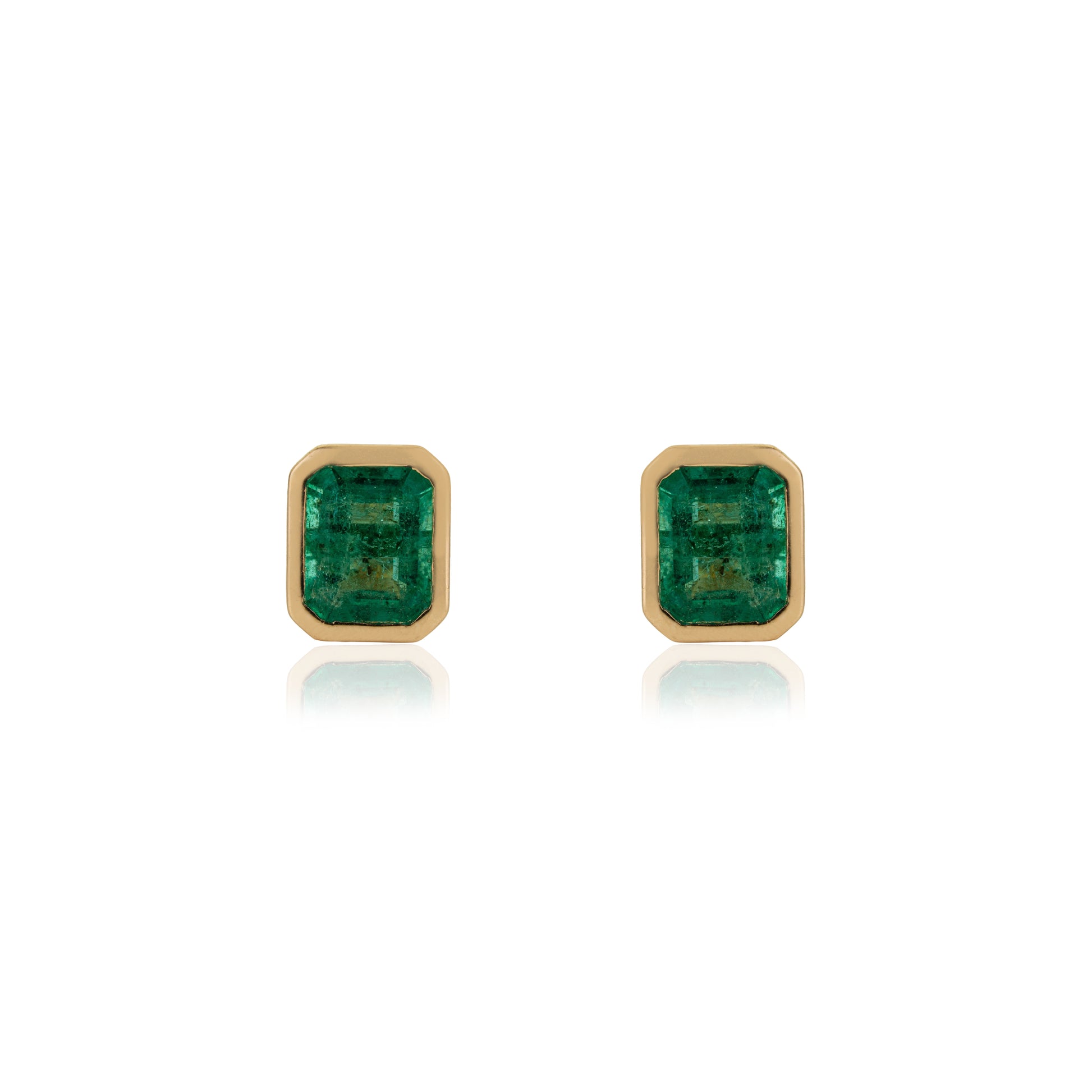 Shop minimalist emerald cut green gemstone stud earrings in gold bezel setting. Perfect for everyday wear, gifts & elegant styling.