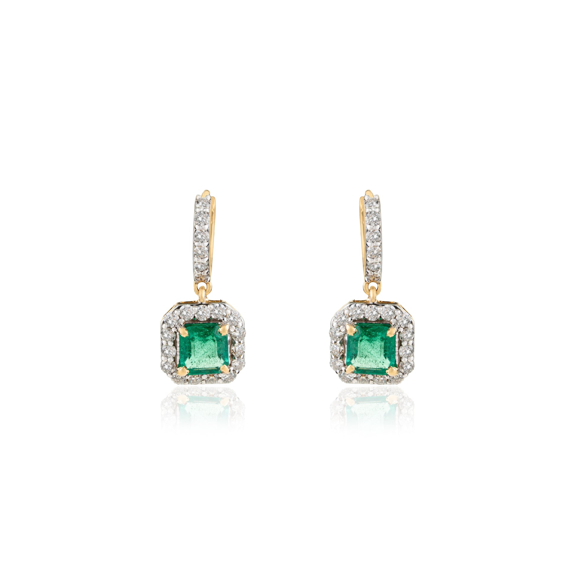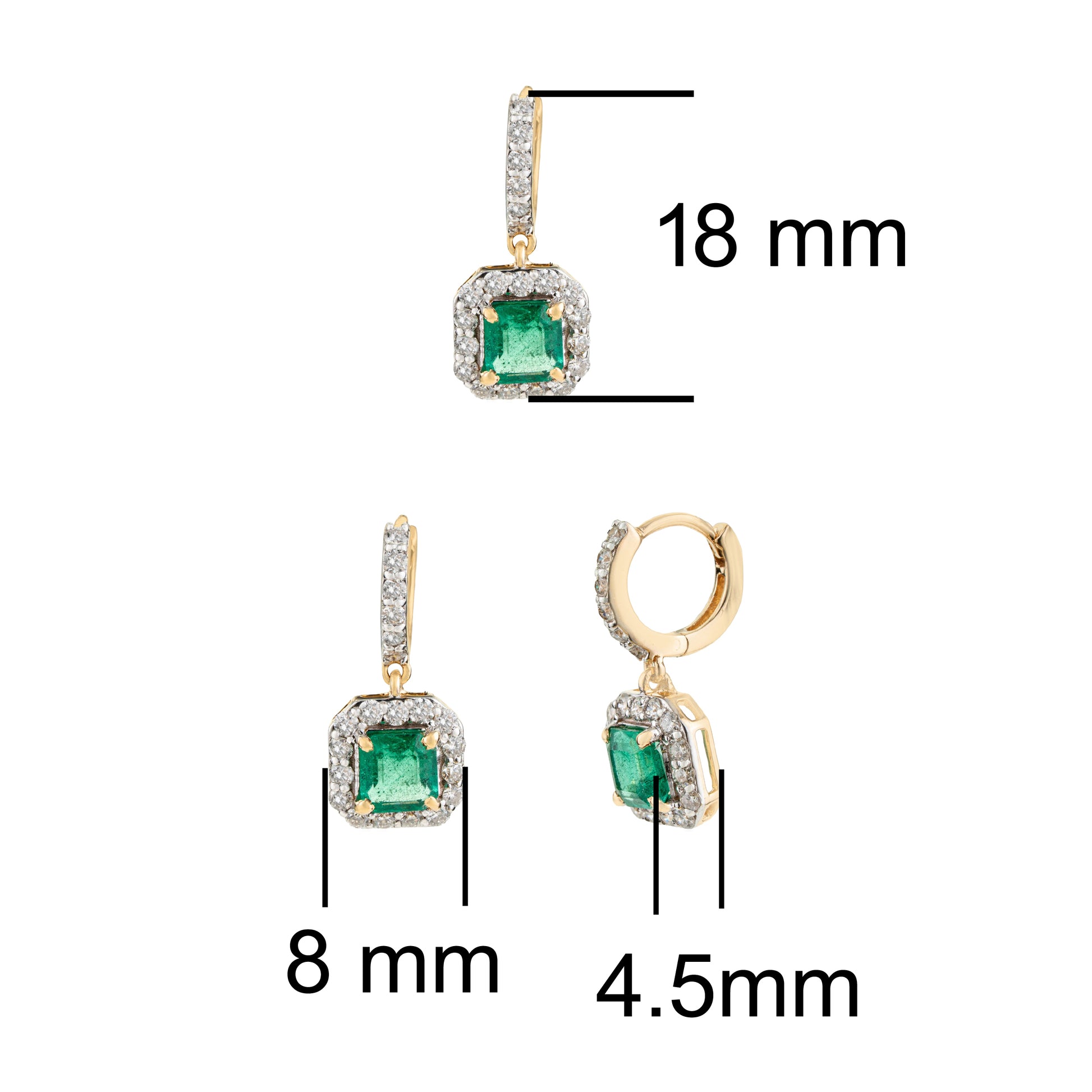 Shop elegant emerald cut green gemstone and diamond halo drop earrings in gold. Perfect luxury huggie earrings for gifts, weddings & everyday wear.