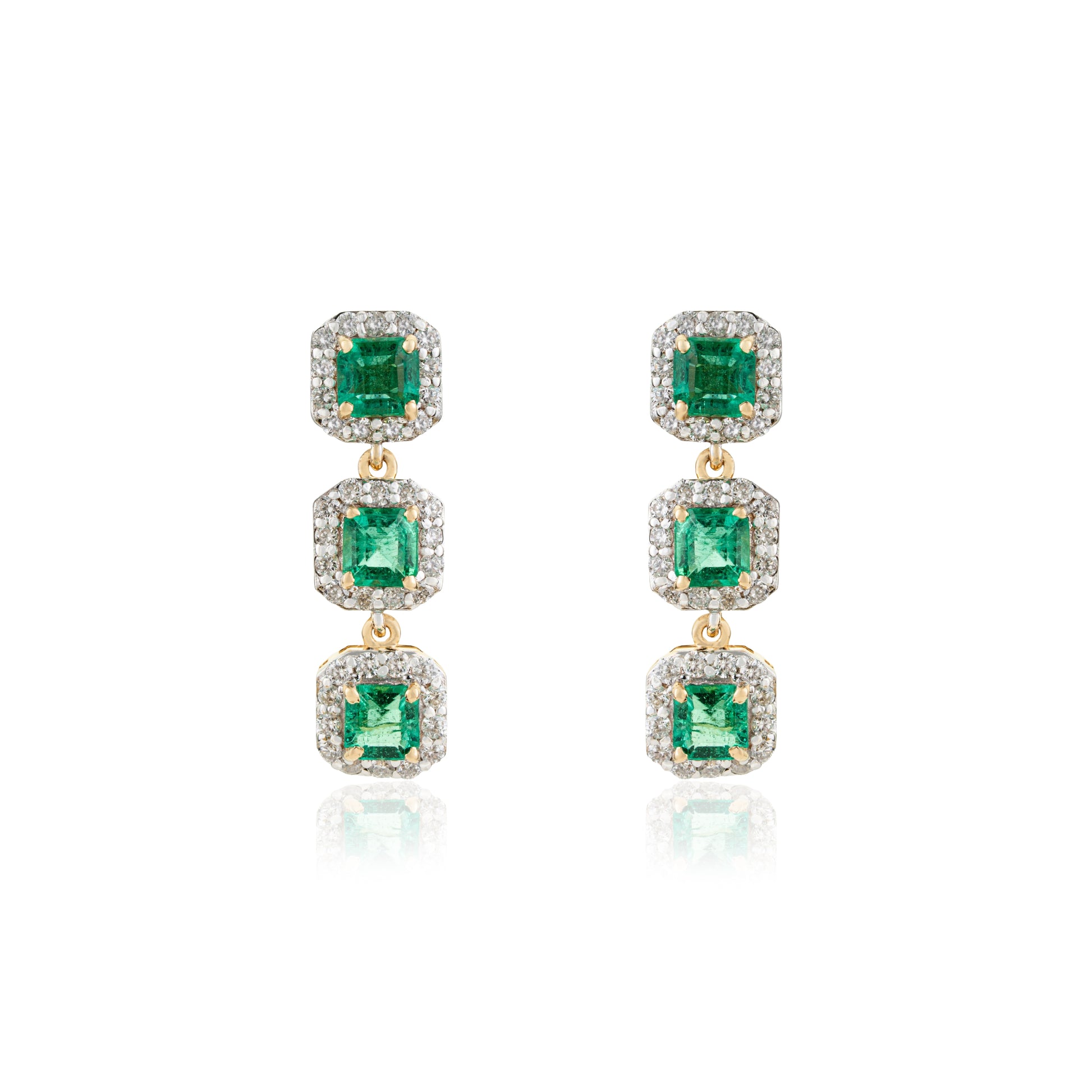 Shop elegant emerald cut green gemstone triple drop earrings with diamond halo in gold. Perfect for weddings, gifts & luxury styling.