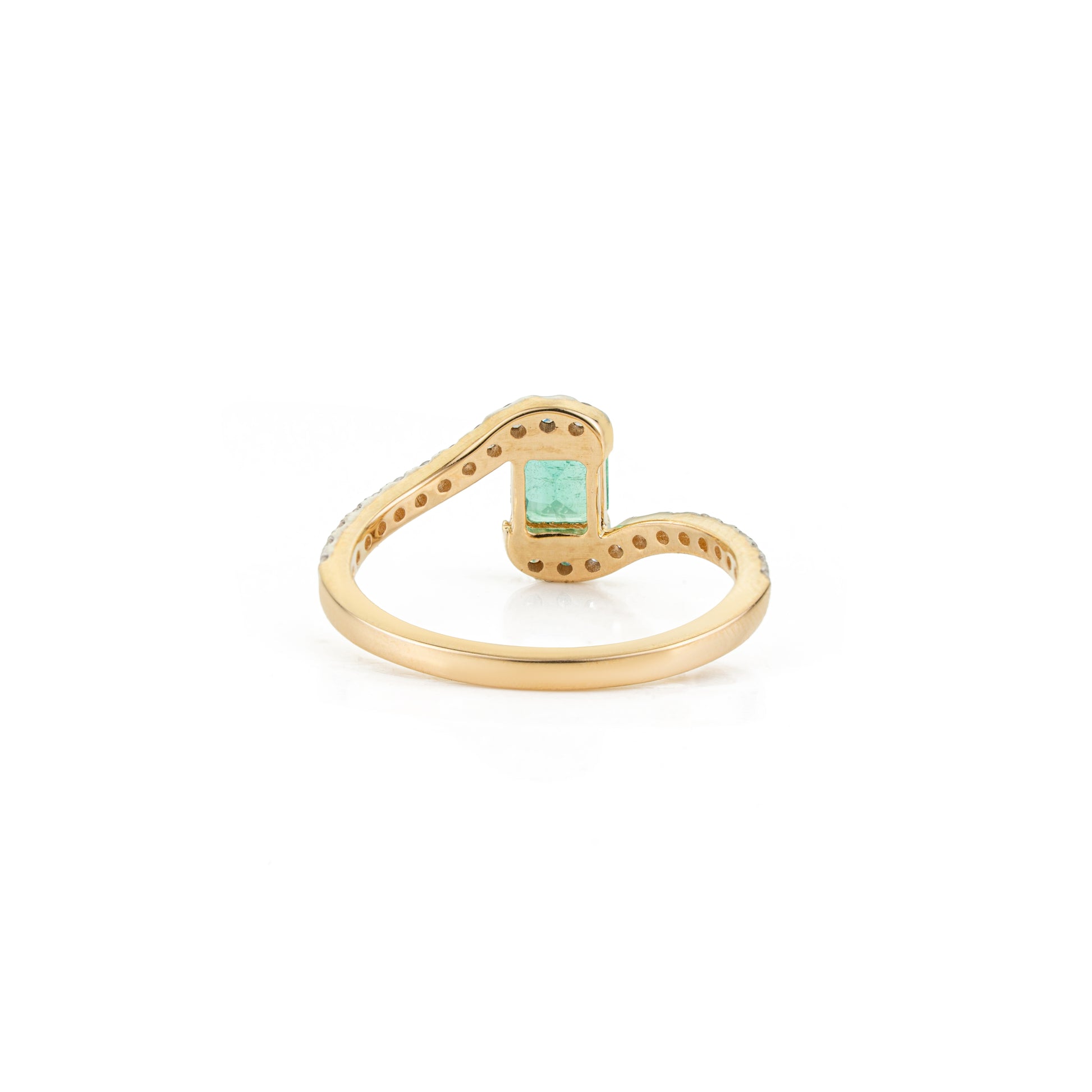 A graceful gold twist ring featuring a vibrant emerald-cut green gemstone, accented with sparkling diamonds. A perfect blend of modern design and timeless elegance.