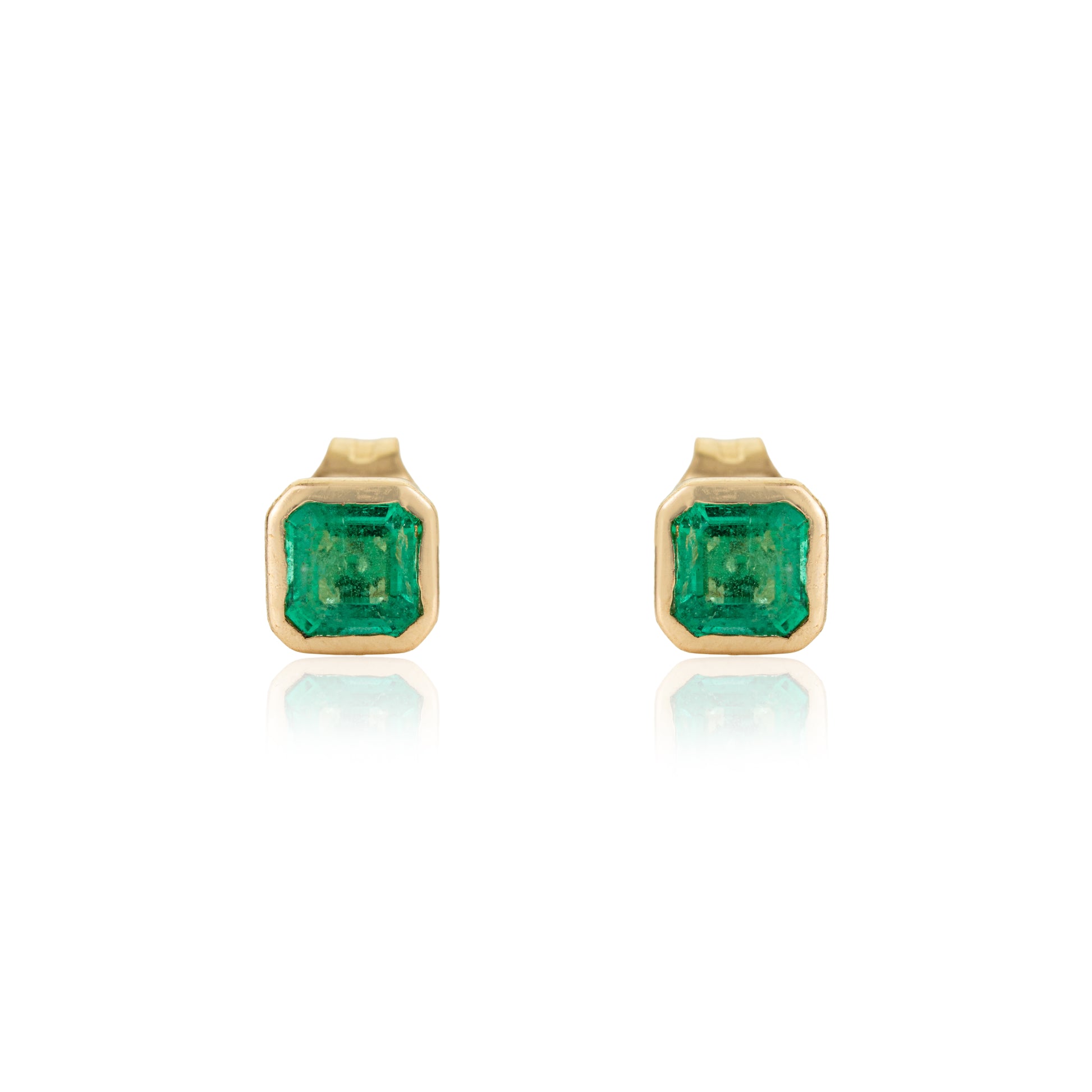 Shop minimalist emerald cut green emerald stud earrings in gold bezel setting. Perfect everyday fine jewelry & elegant gift for her.